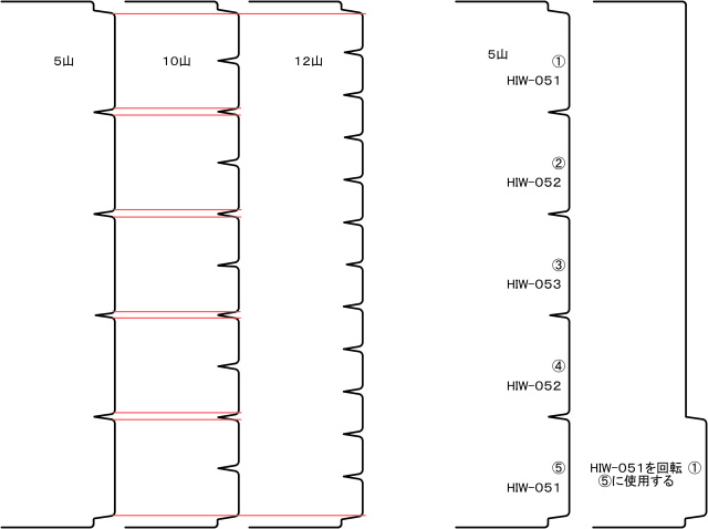 左側の画像は5山1コマと10山2コマ、また5山と12山の上下 1山と2山は180°回転させると4山・5山