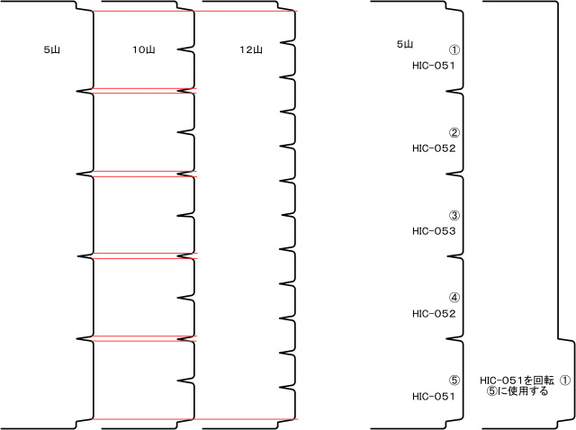 左側の画像は5山1コマと10山2コマ、また5山と12山の上下      1山と2山は180°回転させると4山・5山