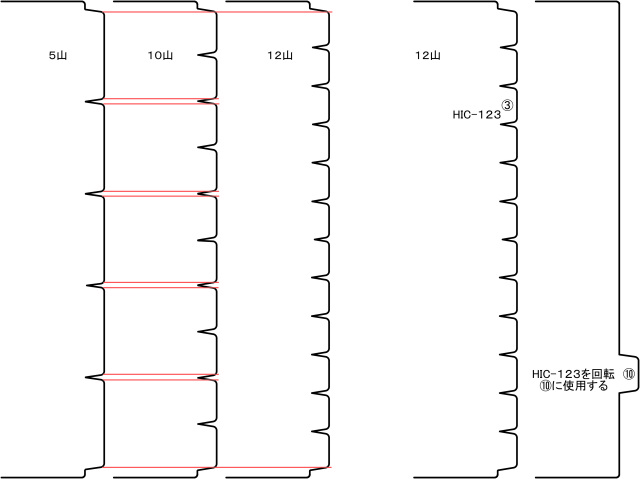 左側の画像は5山1コマと10山2コマ、また5山と12山の上下      3山を180°回転させると10山として